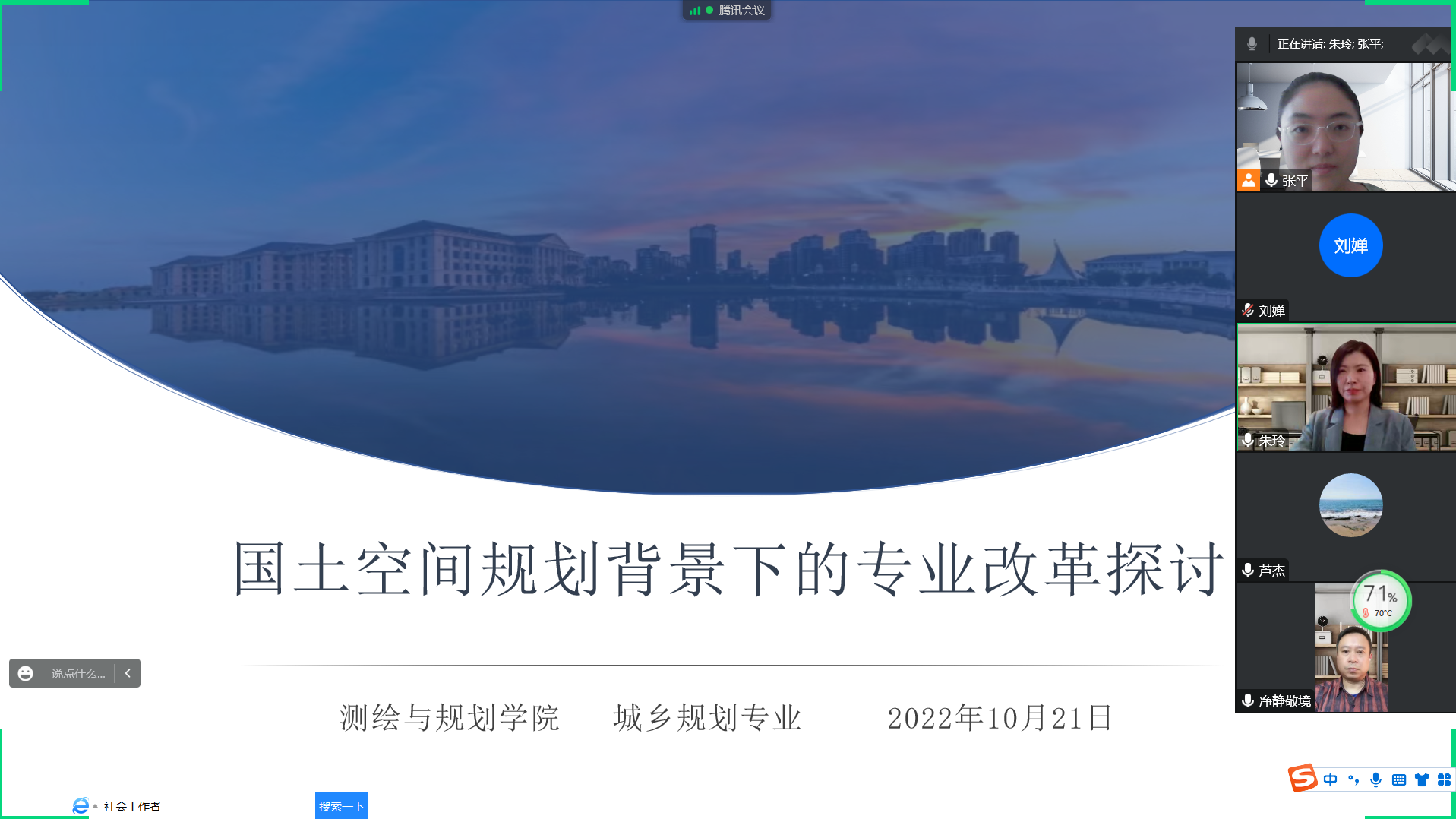 2022年10月21日下午两点半,ylg060net永利城乡规划教研室组织开展了“国土空间规划背景下的专业改革探讨”主题教研活动,该会议因为疫情原因采用腾讯会议线上进行,本次会议由张平老师主持,城乡规划专业全体教师参加。