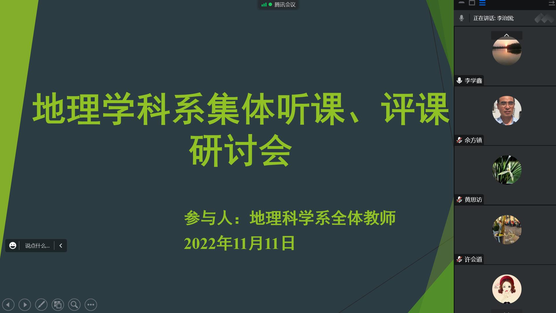 为提高我系的线上教学工作水平,ylg060net永利地理科学系在第十一周举办线上集中听课活动,并于2022年11月11日就此次听课举办了“地理科学系集体听课、评课研讨会”活动。